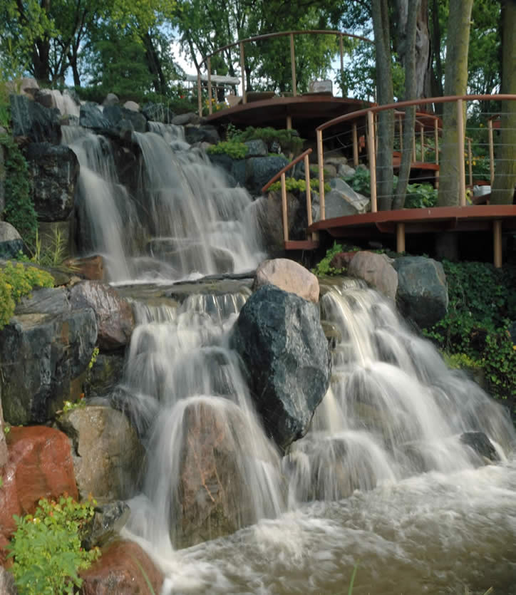 This 25’ tall cascading waterfall is strategically set into the hillside facing the Fox River in Barrington, IL. A multi-level cantilevered patio was built in conjunction with the waterfalls to provide dynamic interacting opportunities.