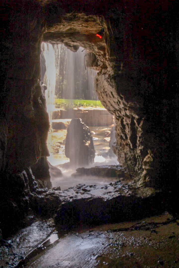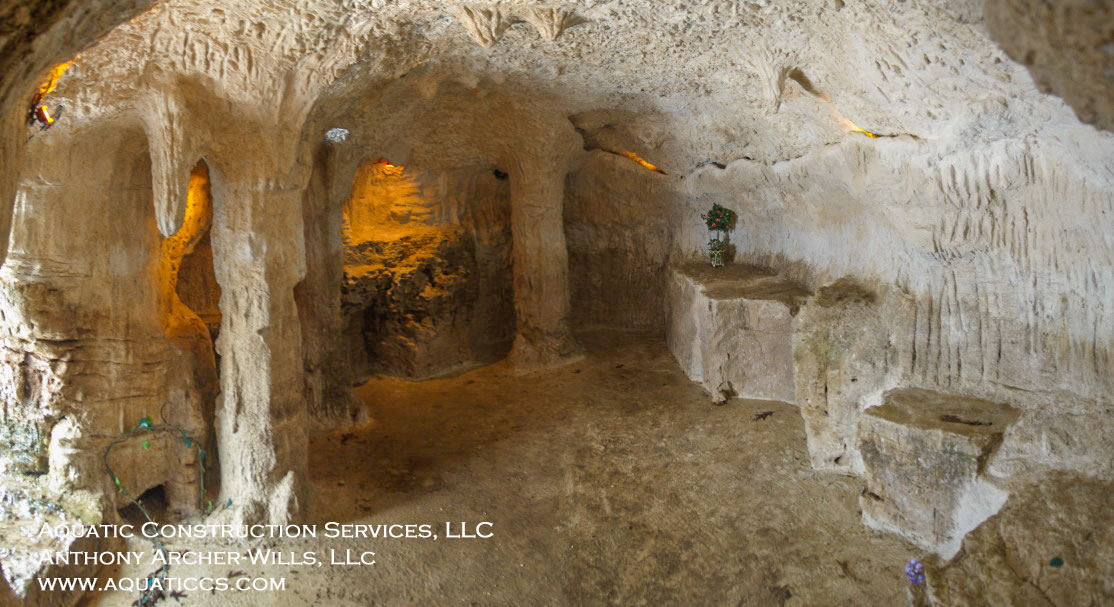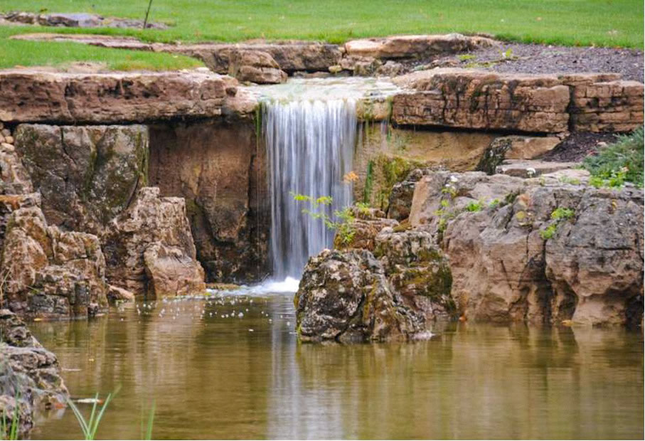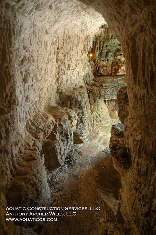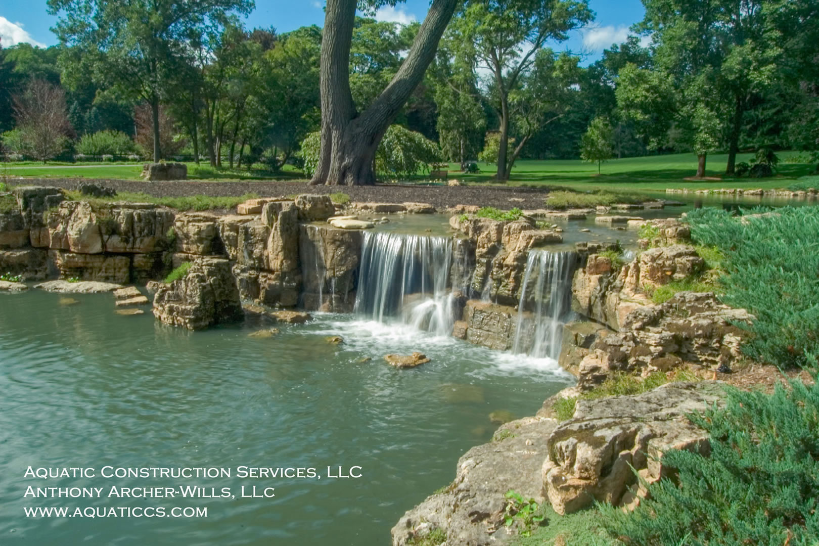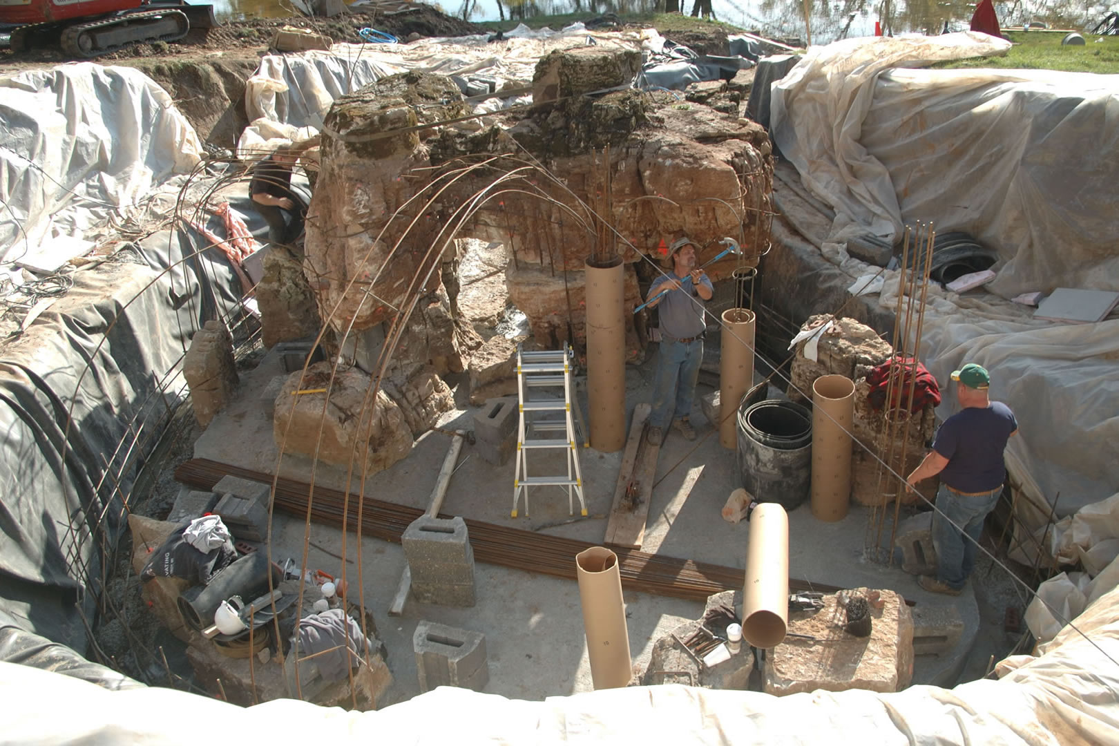 For this renovation of an historic Olmstead landscape, ACS and water garden designer Anthony Archer-Wills created a series of estate ponds, waterfalls and streams following the natural flow of the site. Behind all three waterfalls are grottos of various sizes, to be discovered by adventurous visitors to the property. The most dramatic of these grottos is situated behind the tallest waterfall and measures 22’ L x 12’ W x 9’ H, complete with stalactites and stalagmites.