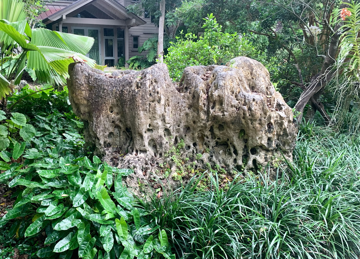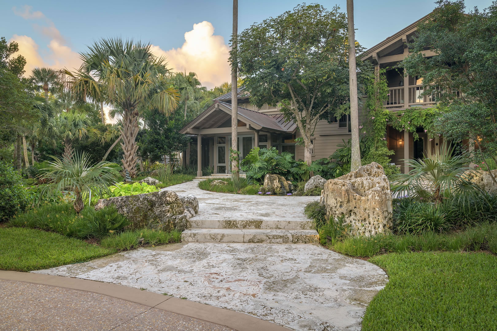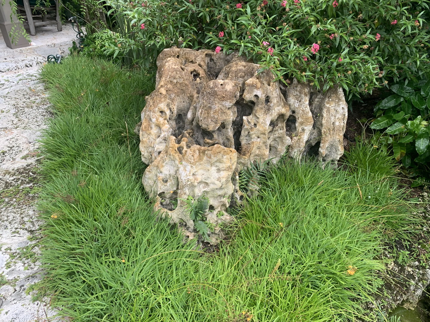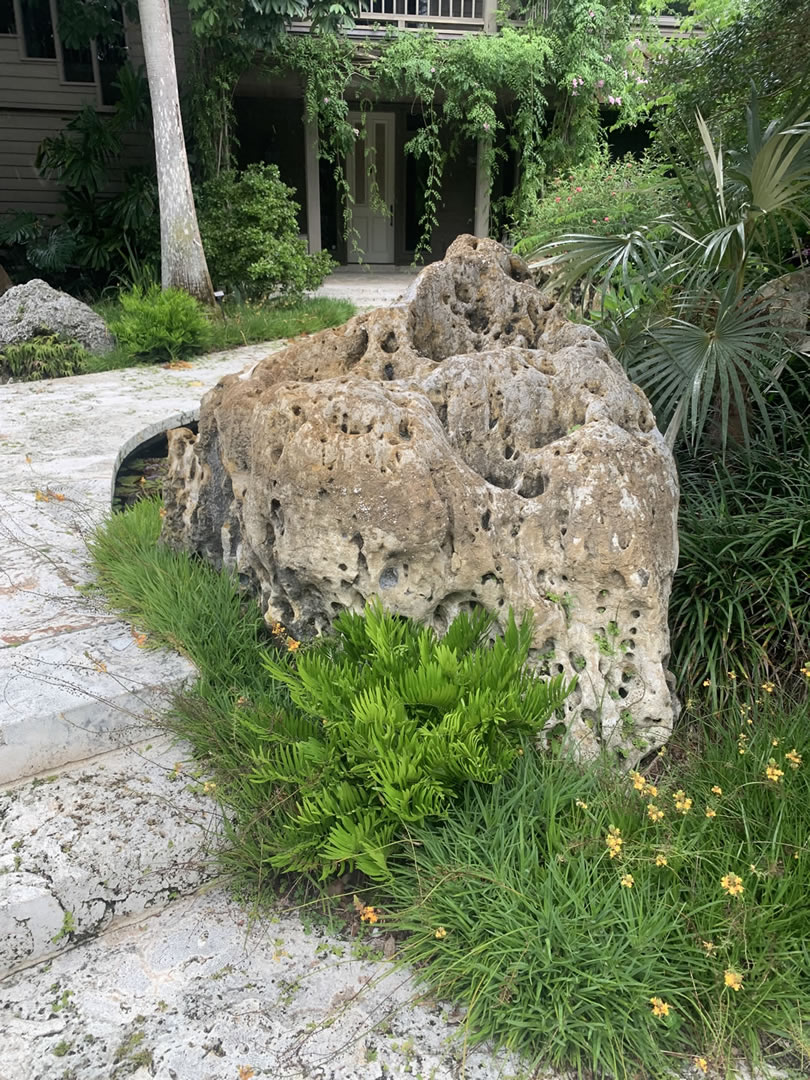 The entire front entrance of this home was transformed from simple sidewalks and grass to a 2,000 SF lush water garden with a cantilevered coral walk leading to the two front doors. A unique rock found during the excavation of a deep lake in Florida was used to create a fountain rock in the south basin of the water feature.