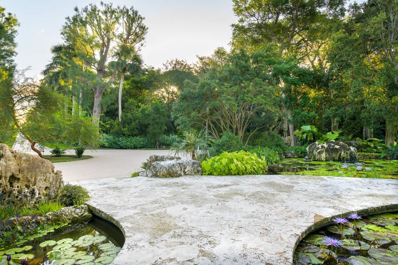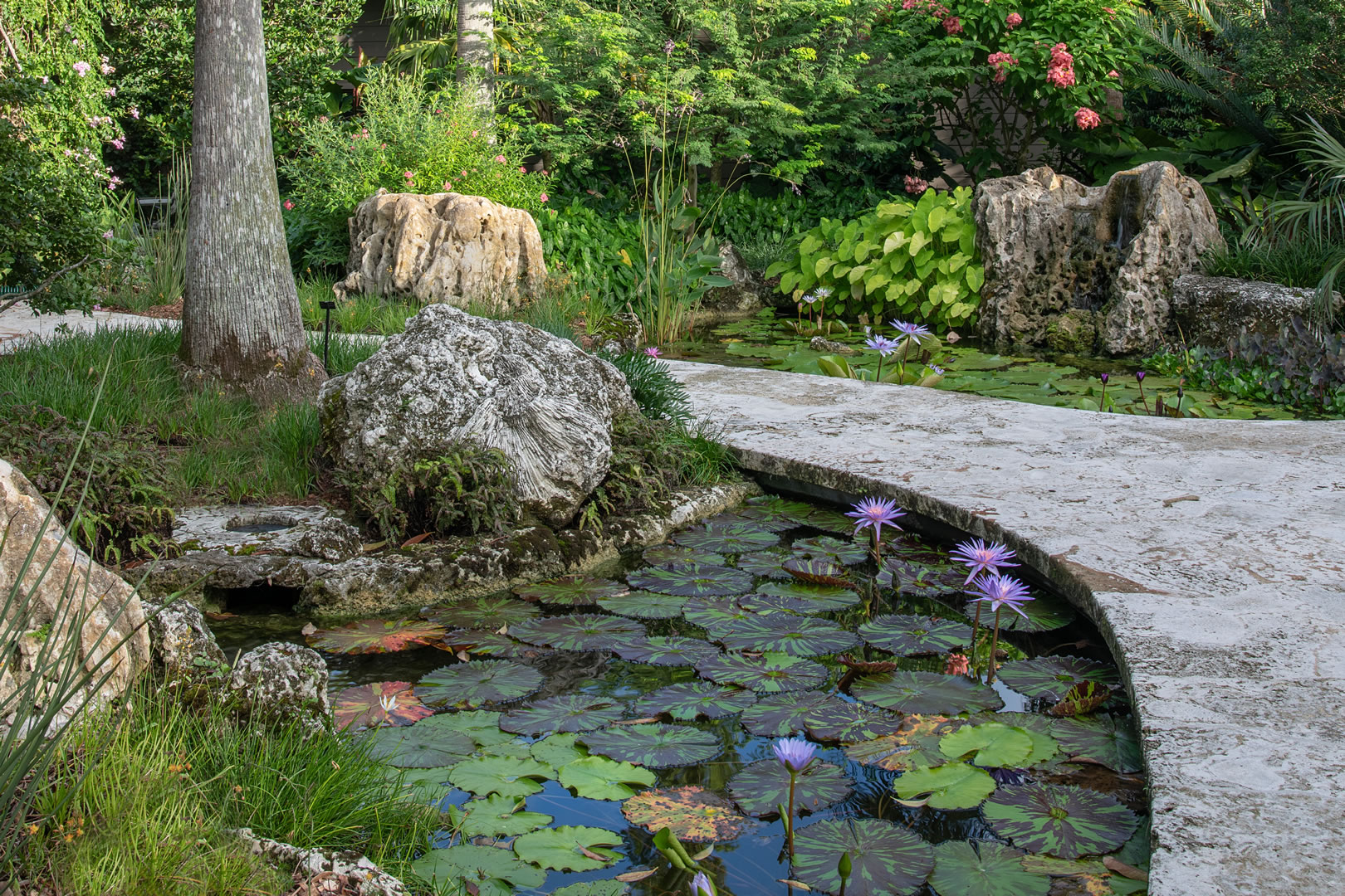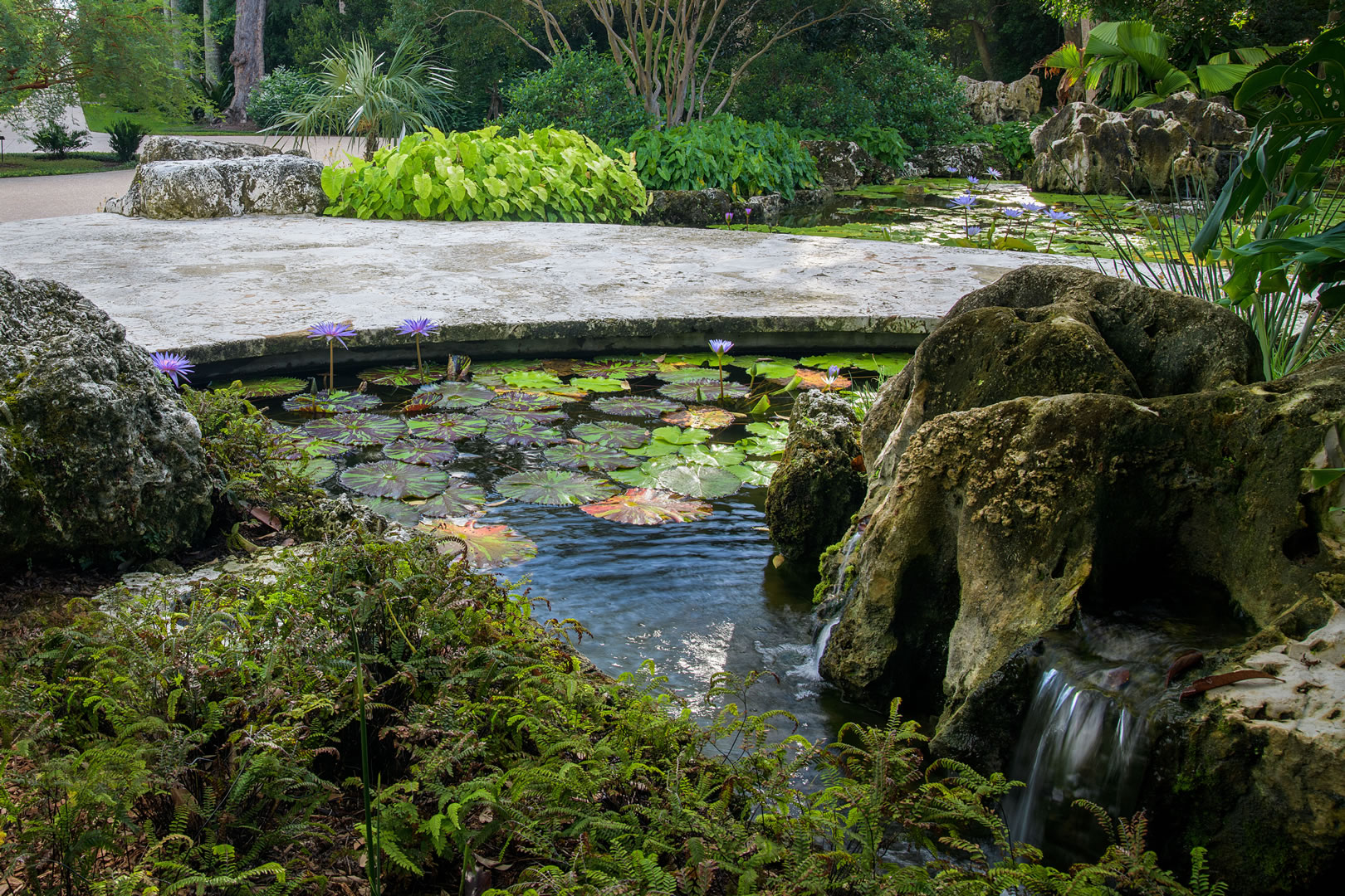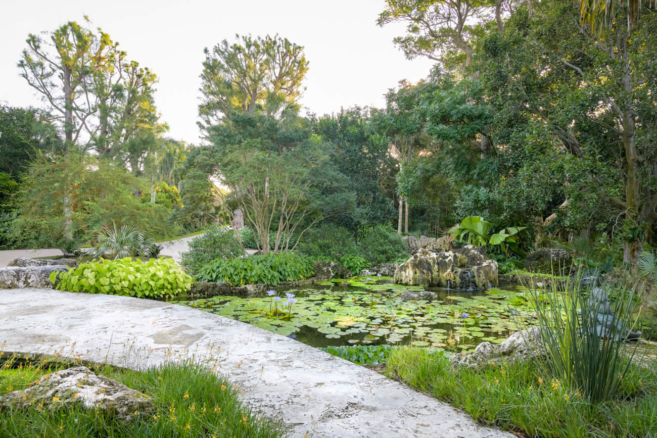 The entire front entrance of this home was transformed from simple sidewalks and grass to a 2,000 SF lush water garden with a cantilevered coral walk leading to the two front doors. A unique rock found during the excavation of a deep lake in Florida was used to create a fountain rock in the south basin of the water feature.