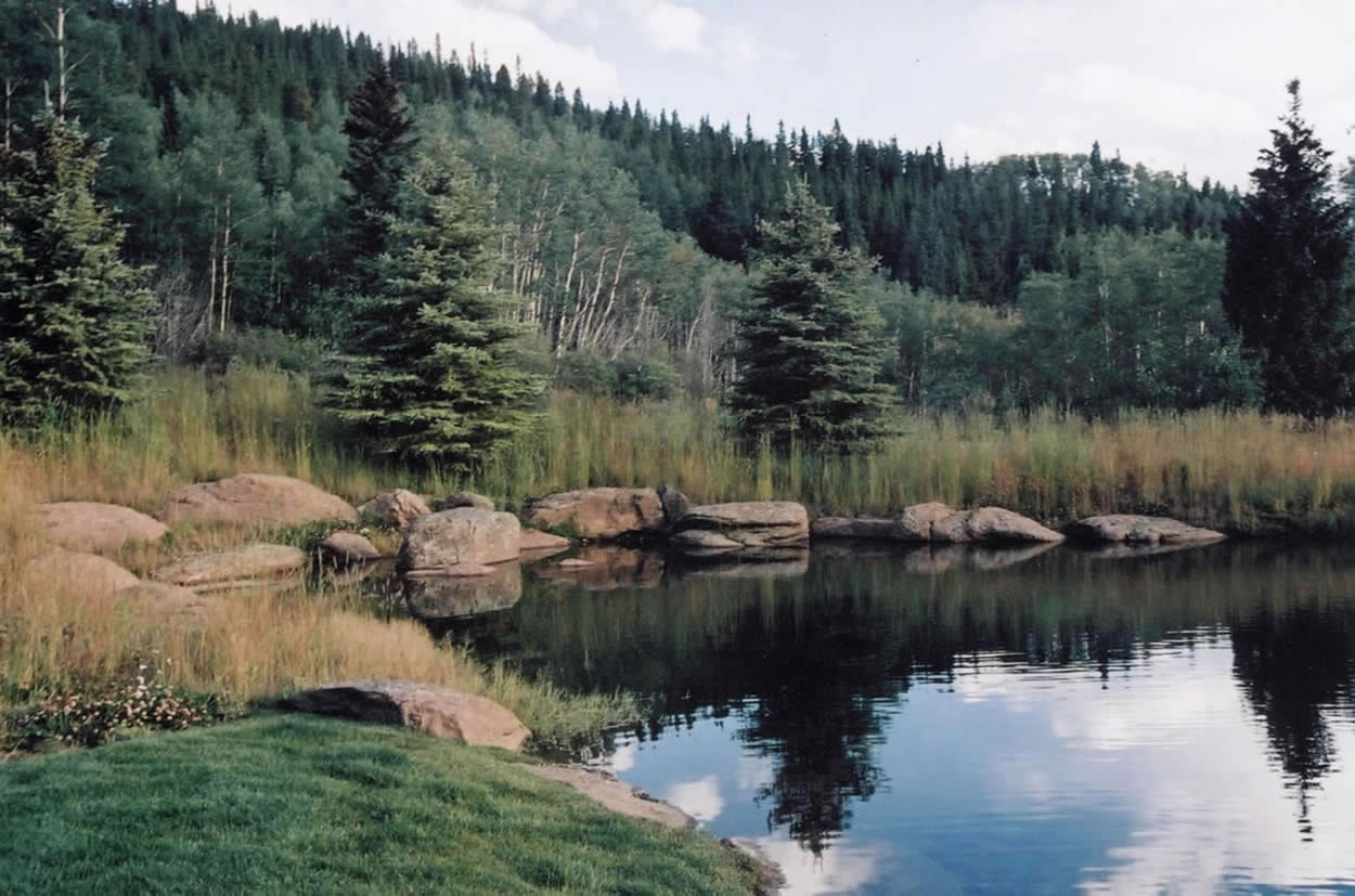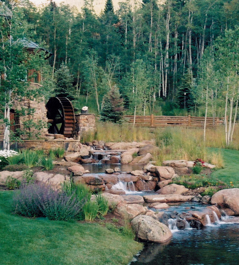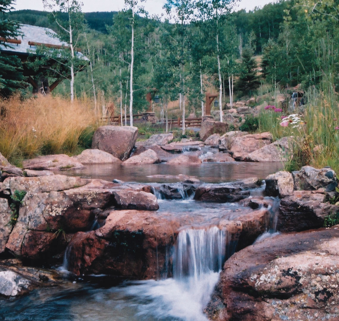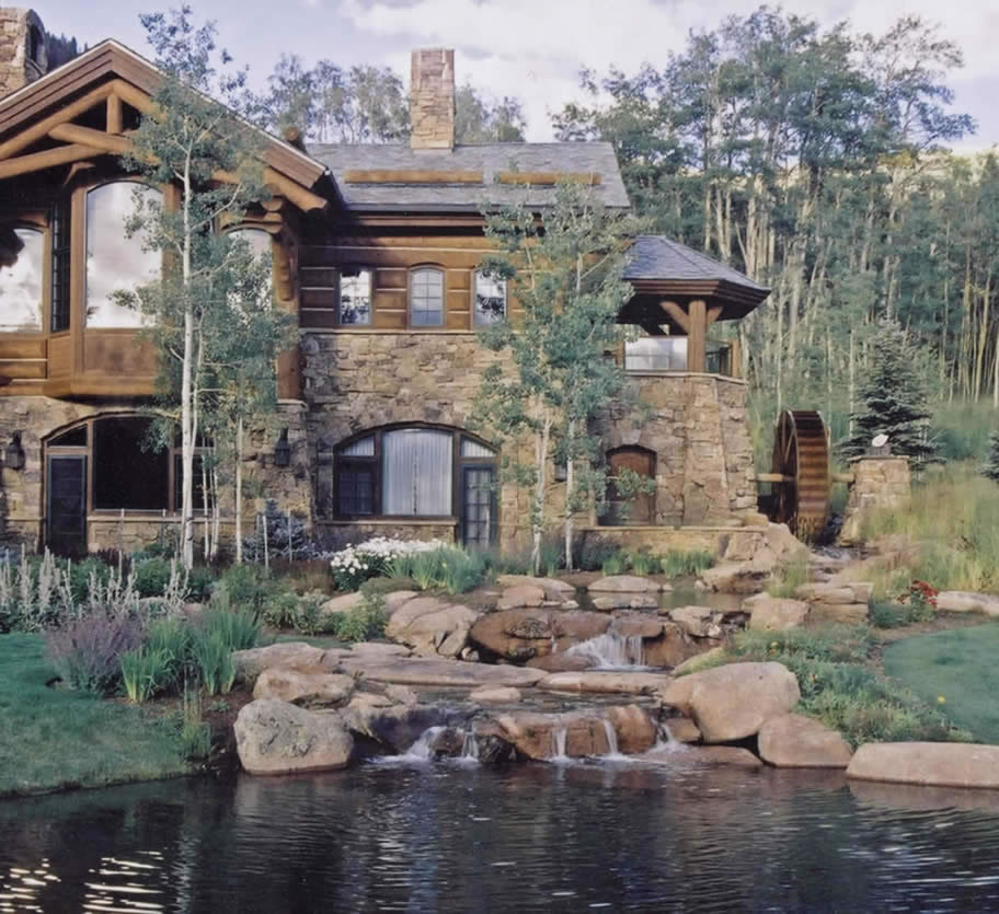 This timber home, multi-level trout ponds, cascading streams and waterfalls is located at 9,600’ elevation in Silverthorne, CO. All water flow in streams and trout ponds is provided solely by melting ice further up the mountainside. After the water cascades through the waterfalls and trout ponds, it returns to its original stream in the mountains. This natural water feature effect provides the clients with an ever-changing visual and audible experience.