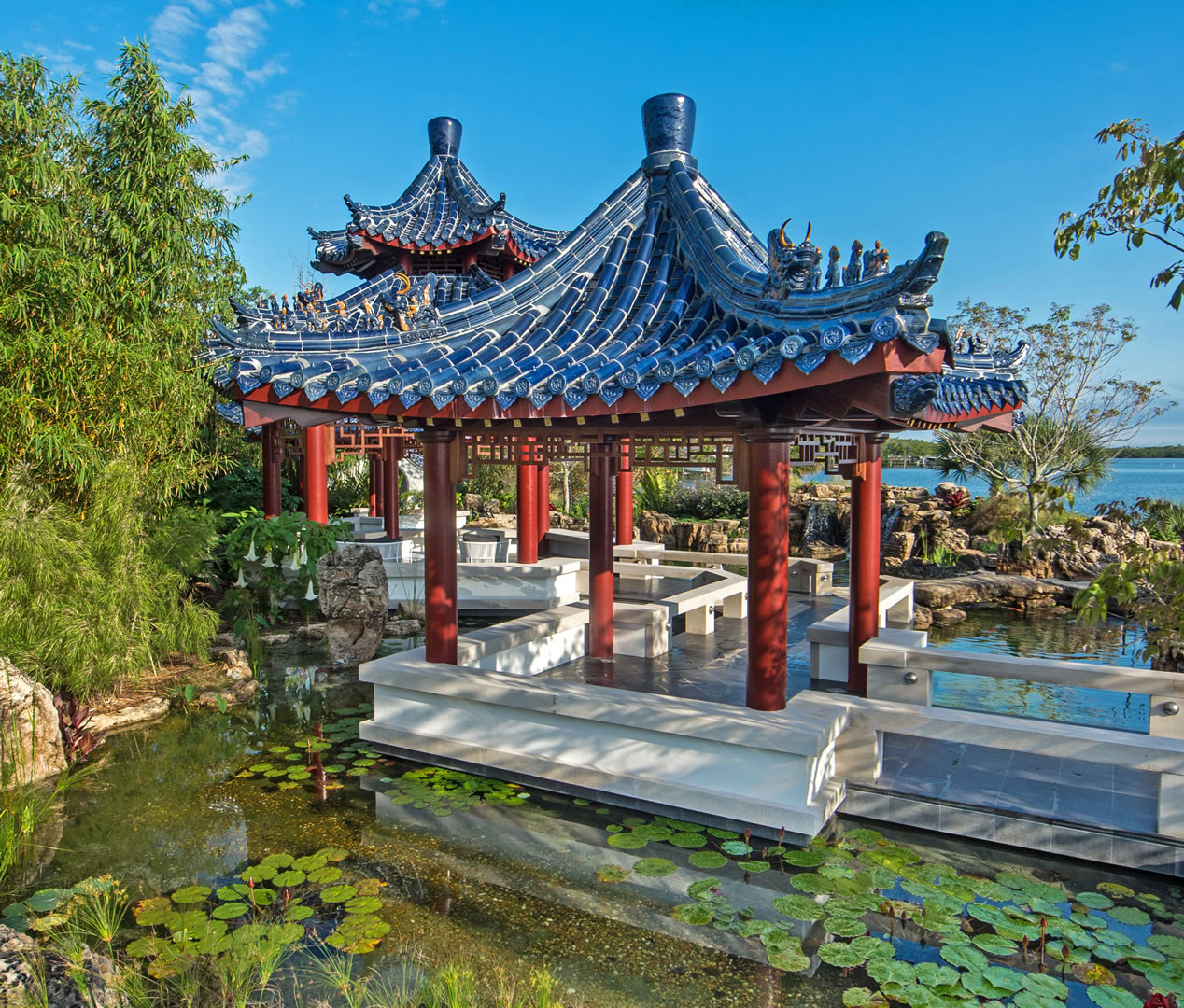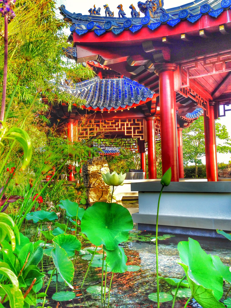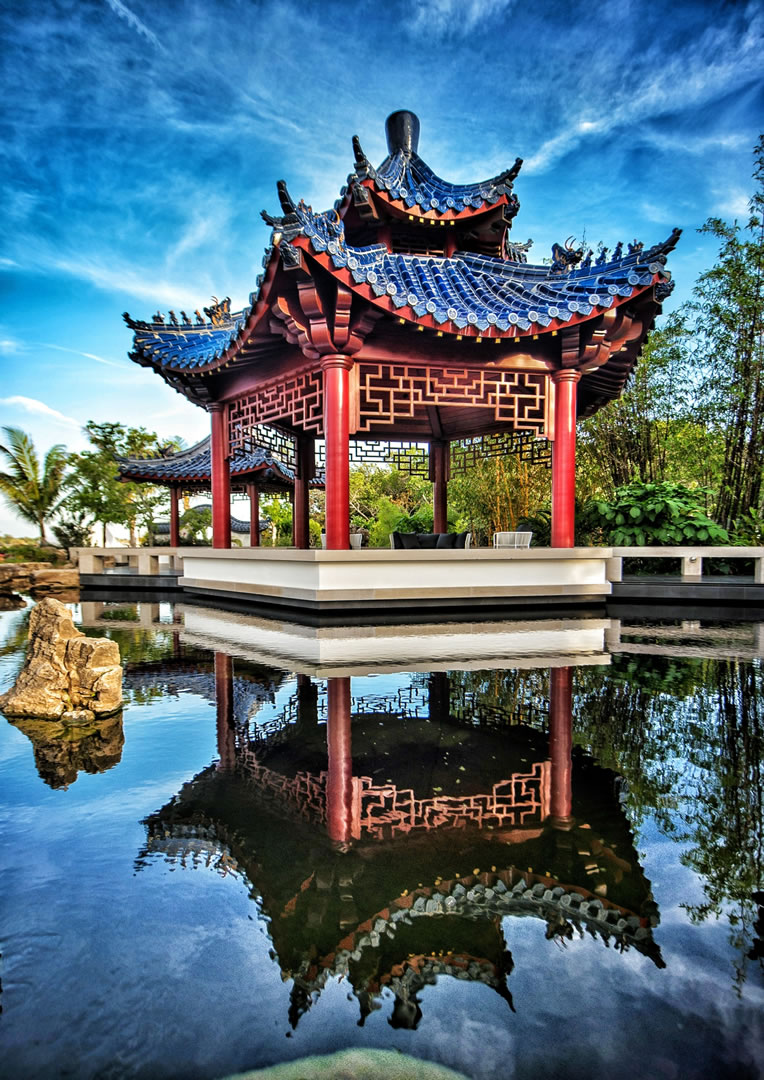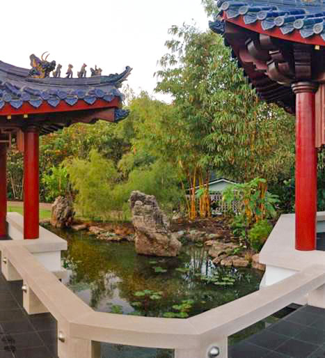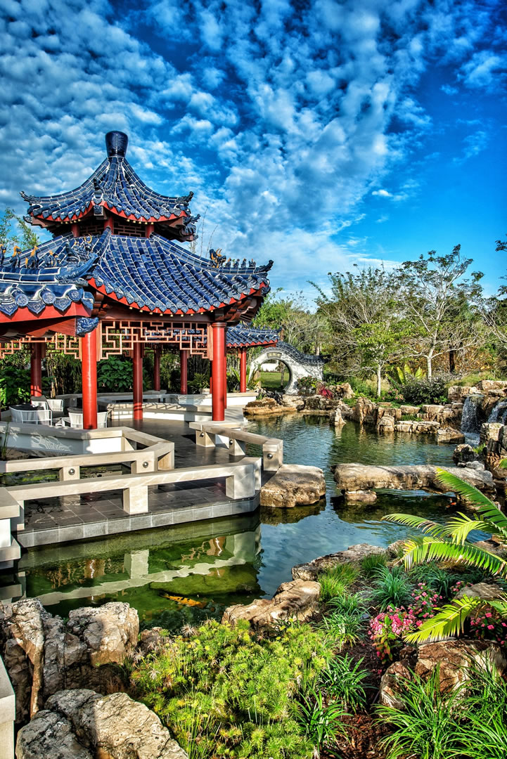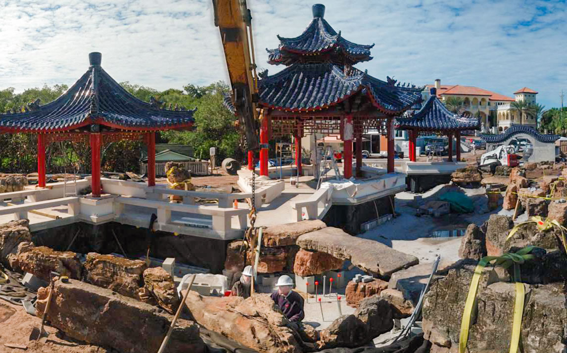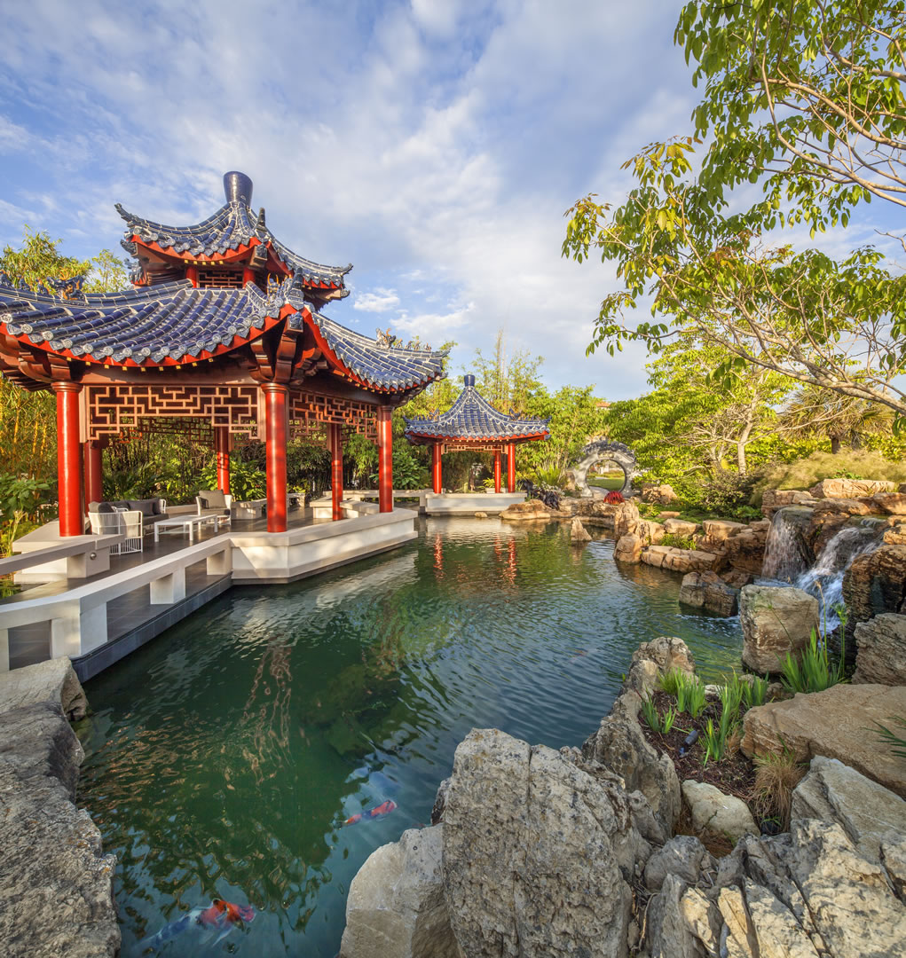 For this spectacular Chinese pagoda garden, ACS designed and built the surrounding 16,000 gallon koi pond, water garden and three waterfalls. Rock selection and placement for an Asian garden is key – ACS hand-selected every rock including the traditional scholar rocks, positioned near pathways and for key focal areas as well as the one-of-a-kind, long, arched weathered bridge stone seen in these photos.