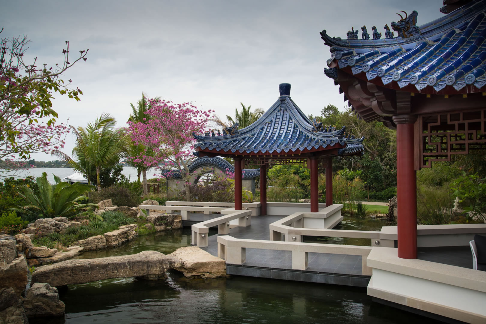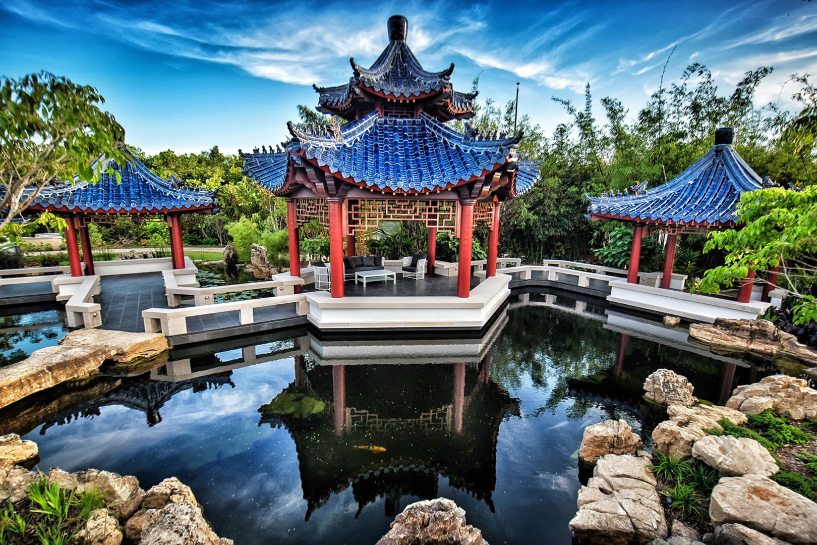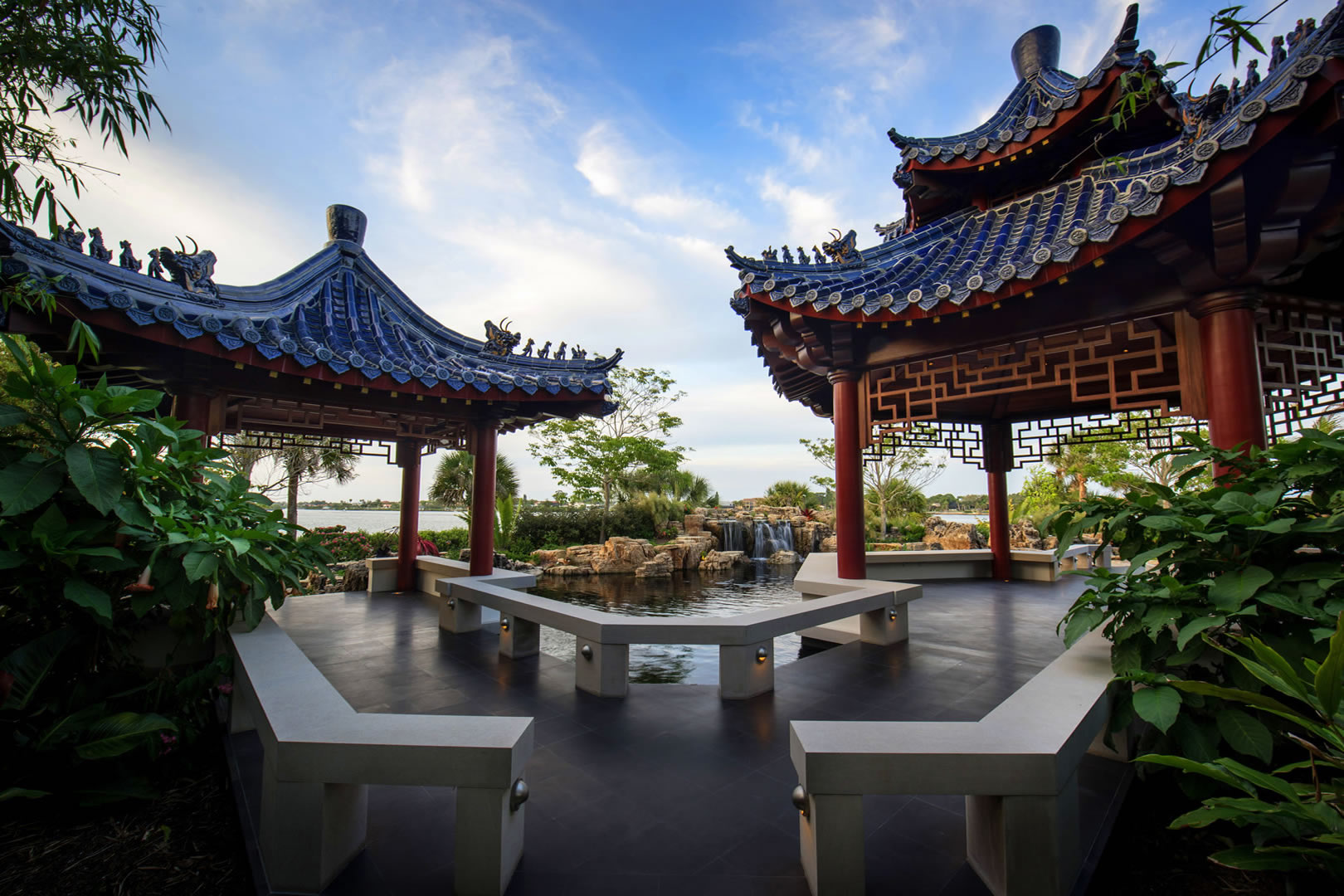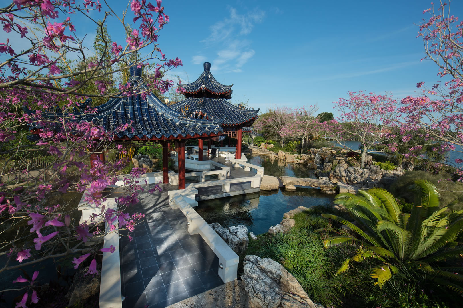 For this spectacular Chinese pagoda garden, ACS designed and built the surrounding 16,000 gallon koi pond, water garden and three waterfalls. Rock selection and placement for an Asian garden is key – ACS hand-selected every rock including the traditional scholar rocks, positioned near pathways and for key focal areas as well as the one-of-a-kind, long, arched weathered bridge stone seen in these photos.