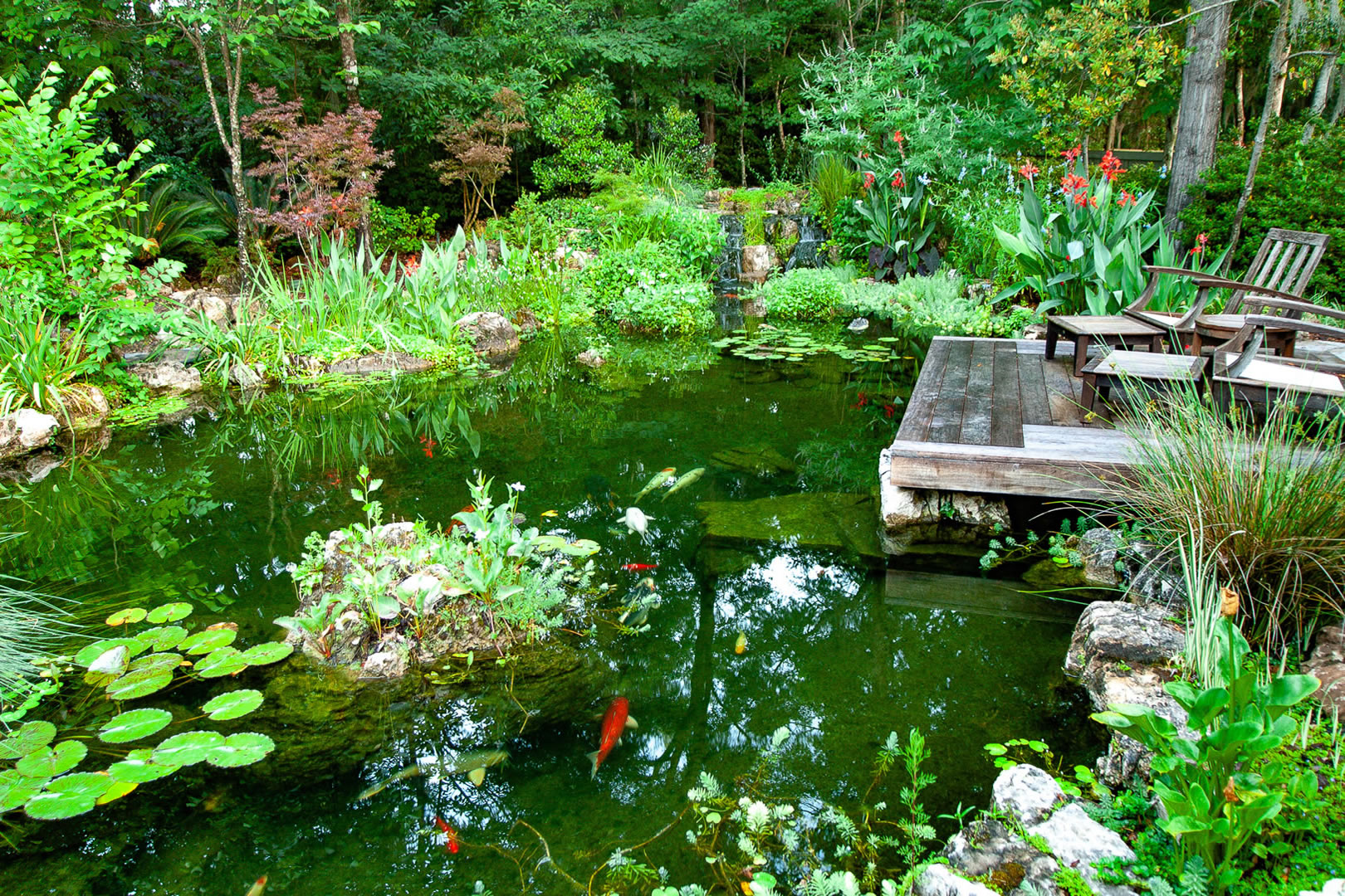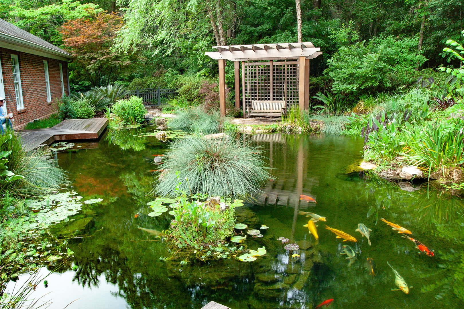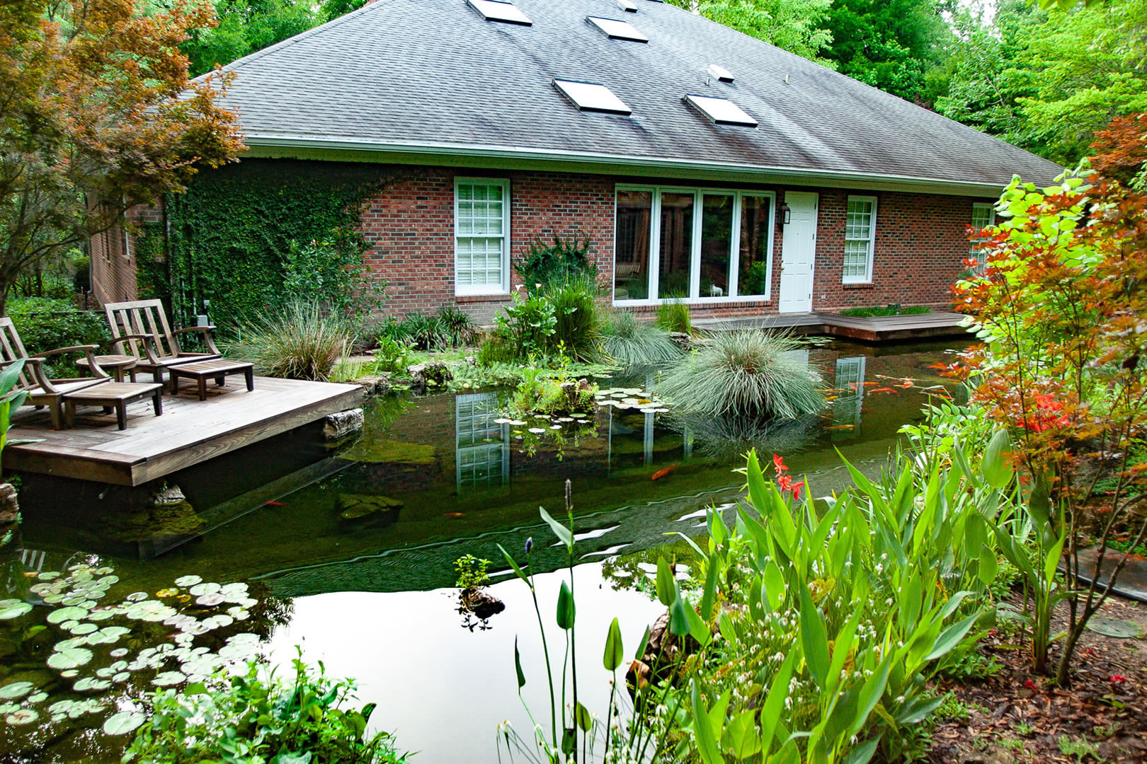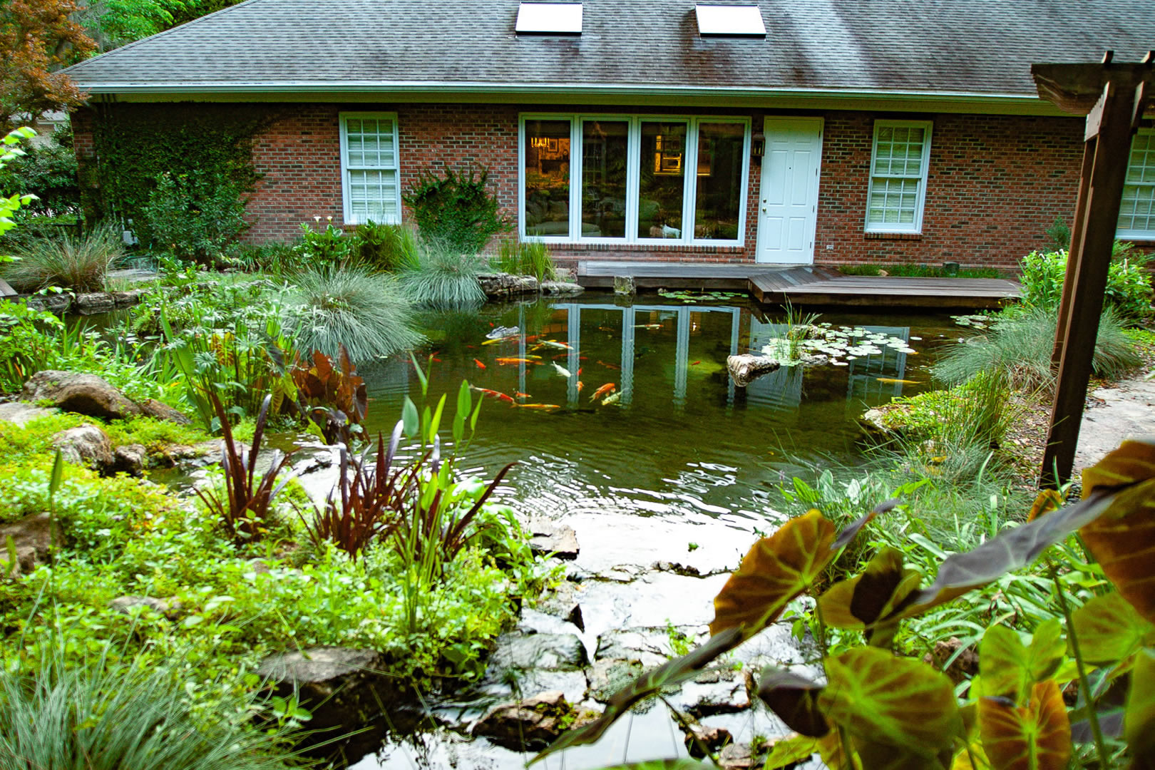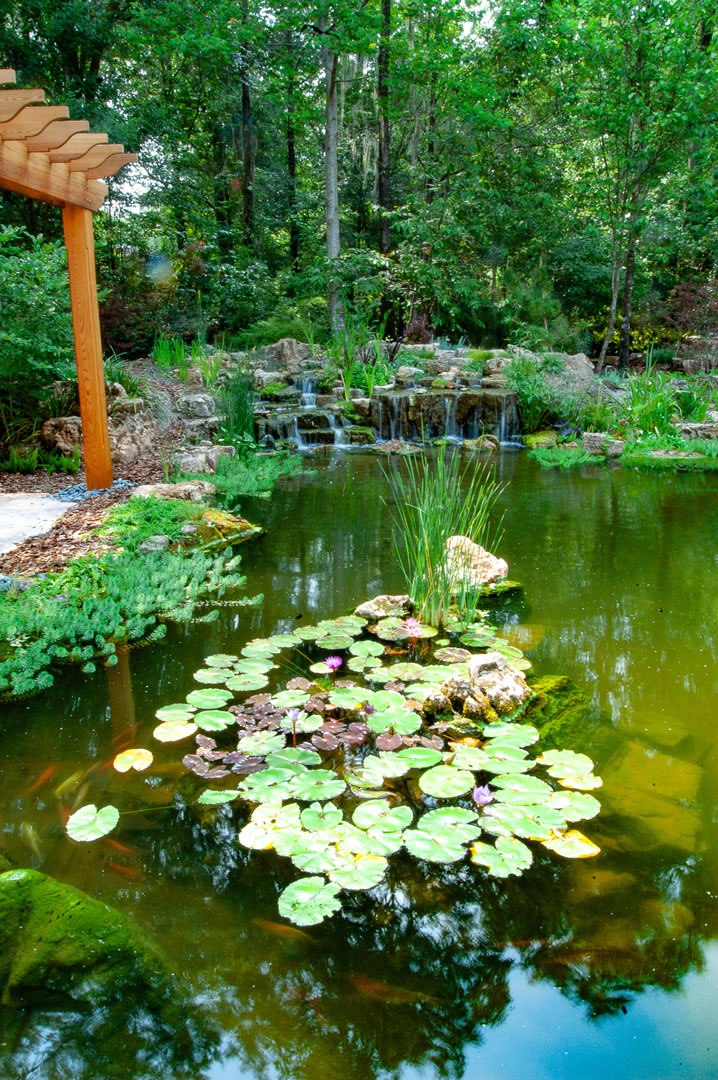 What was once a plain backyard lawn comes alive with water and aquatic life, right up to the living space! Two cantilevered decks are set on rock outcroppings, enhancing the natural look. Likewise, two waterfalls were designed to be seen only from certain focal points and ‘destinations,’ making this pond personal and interactive.