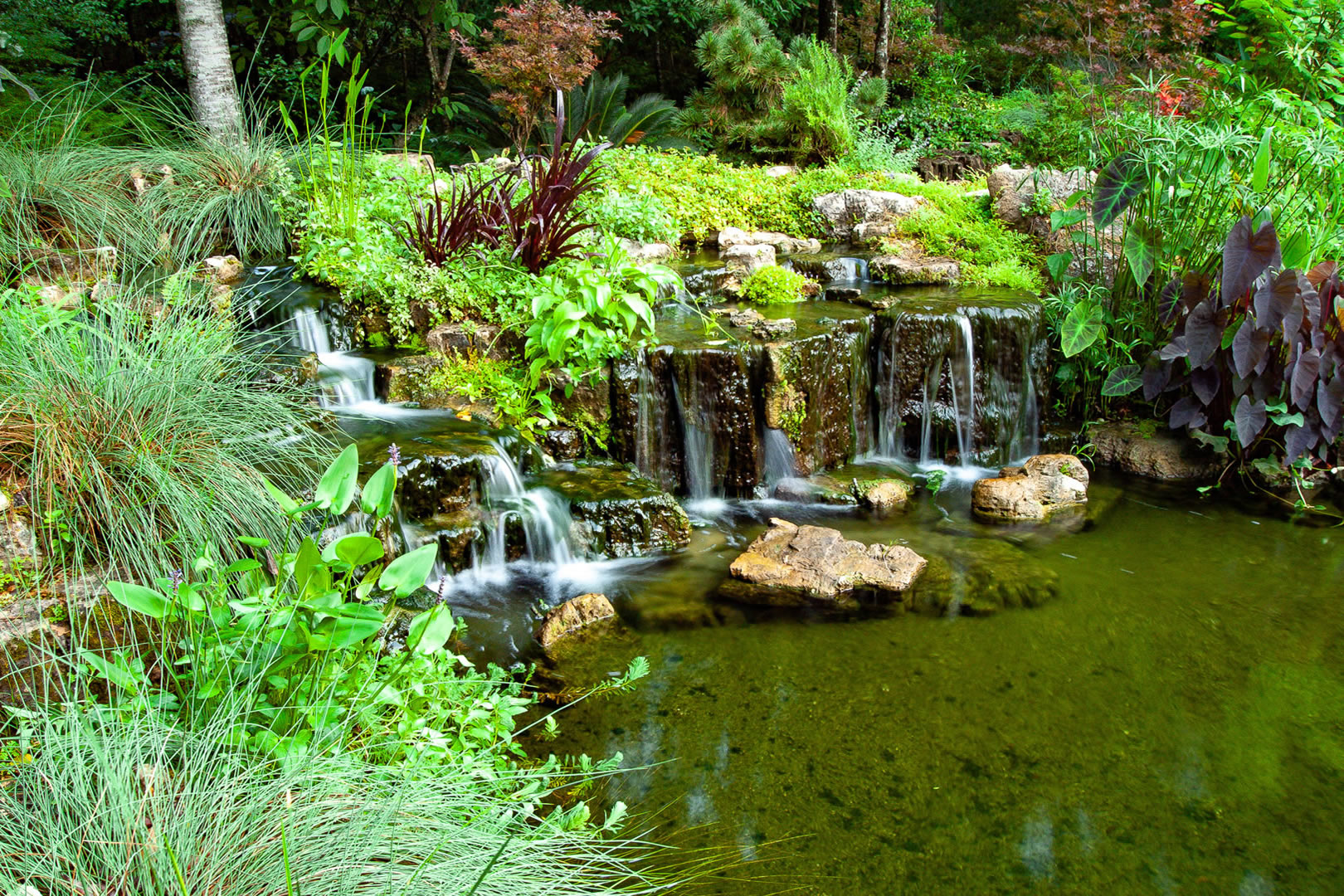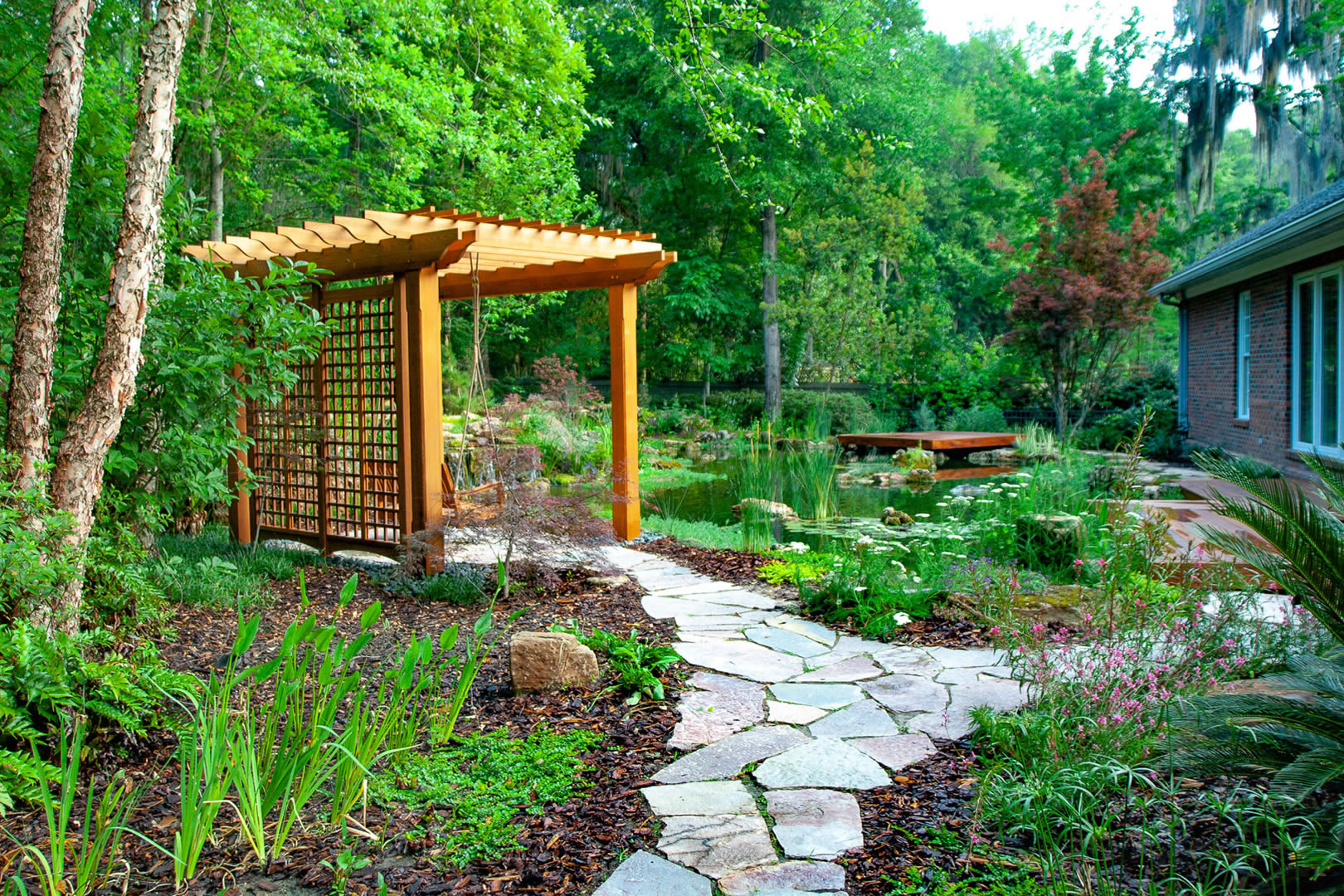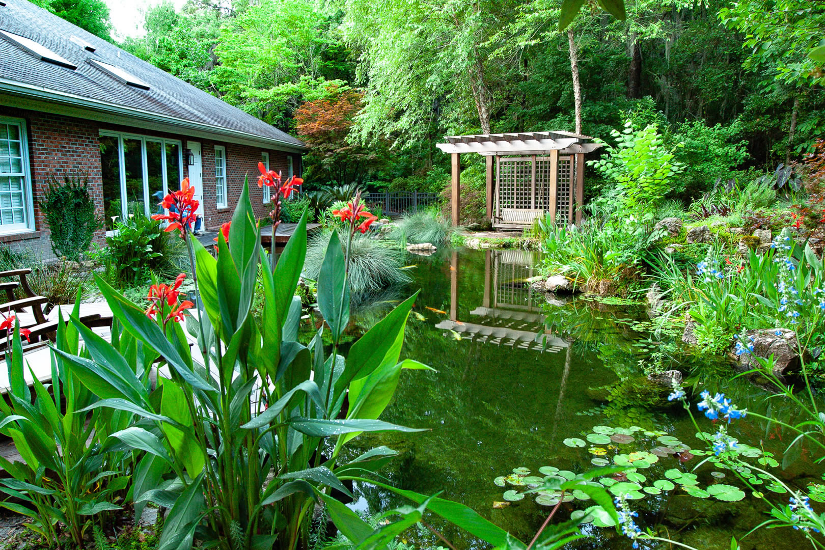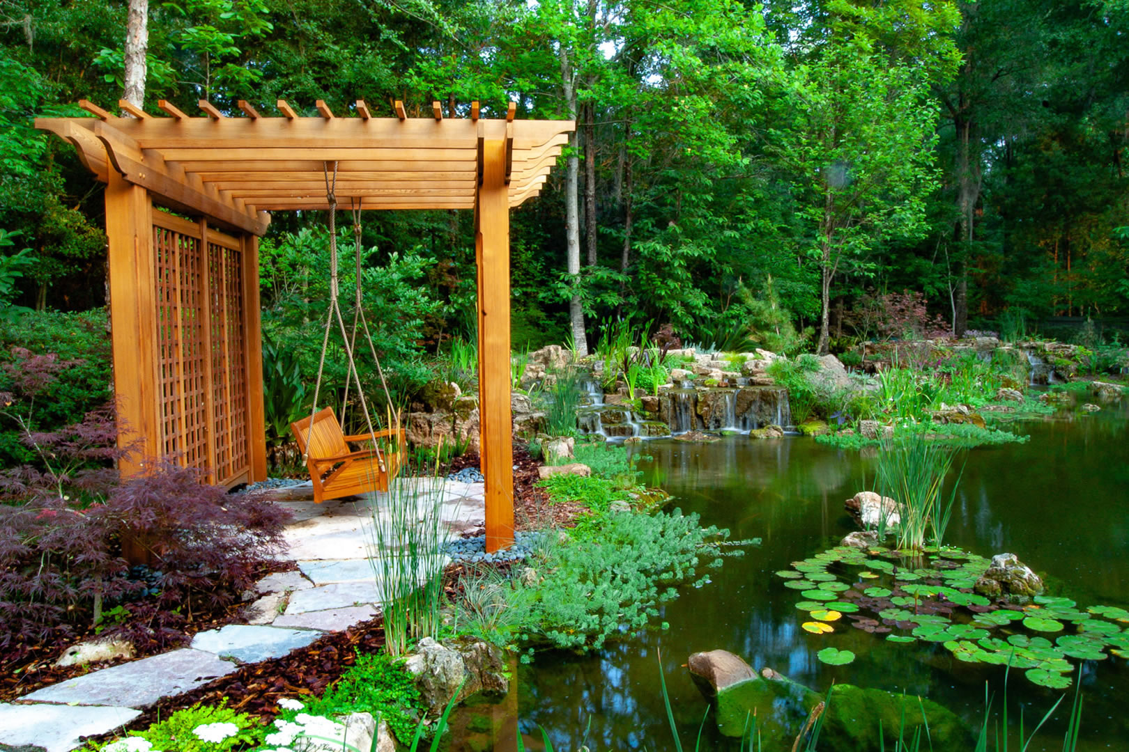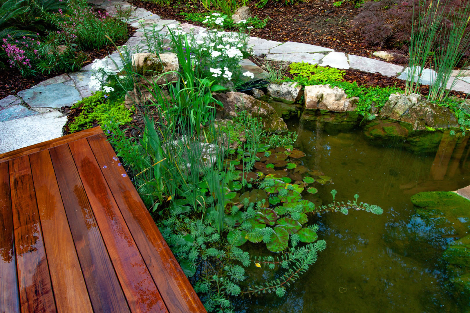 What was once a plain backyard lawn comes alive with water and aquatic life, right up to the living space! Two cantilevered decks are set on rock outcroppings, enhancing the natural look. Likewise, two waterfalls were designed to be seen only from certain focal points and ‘destinations,’ making this pond personal and interactive.