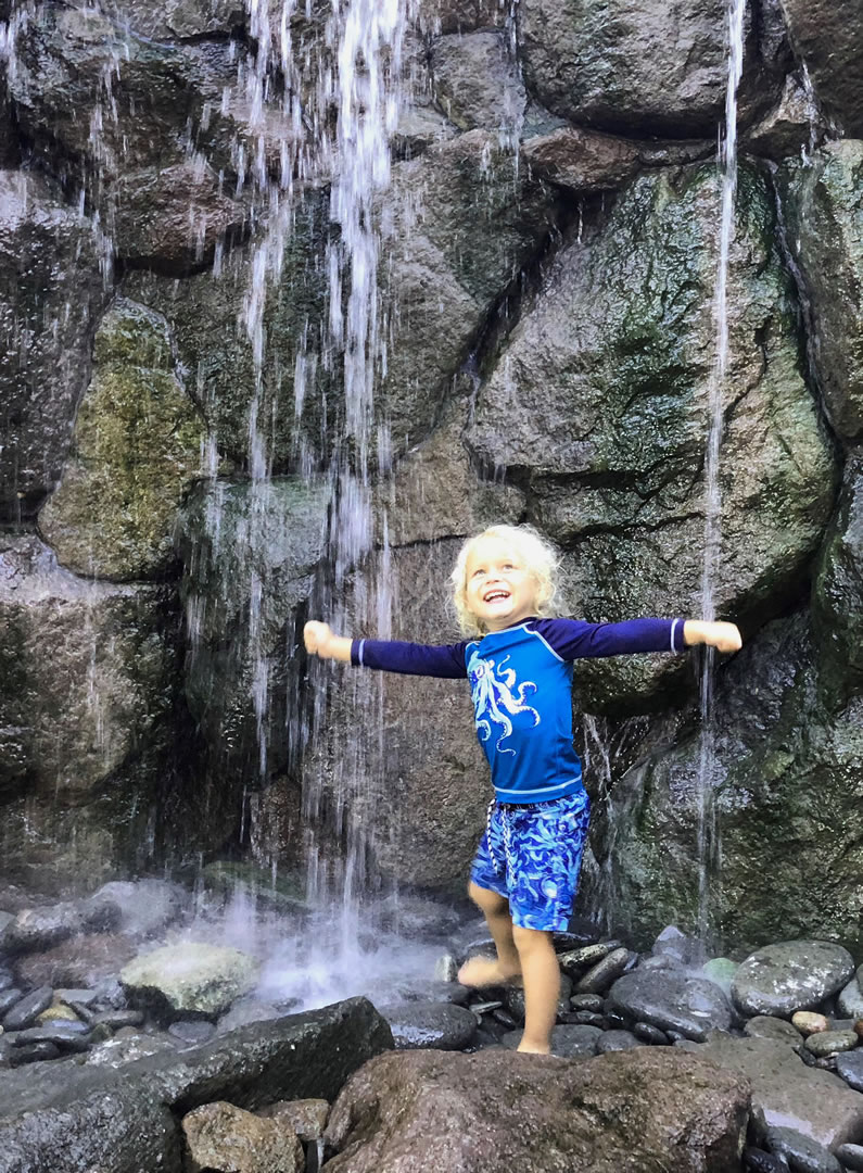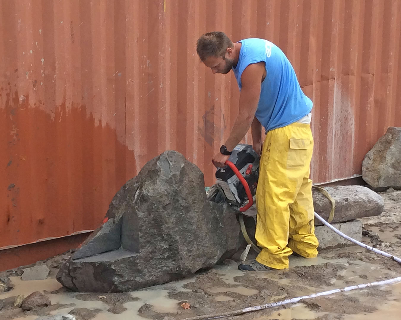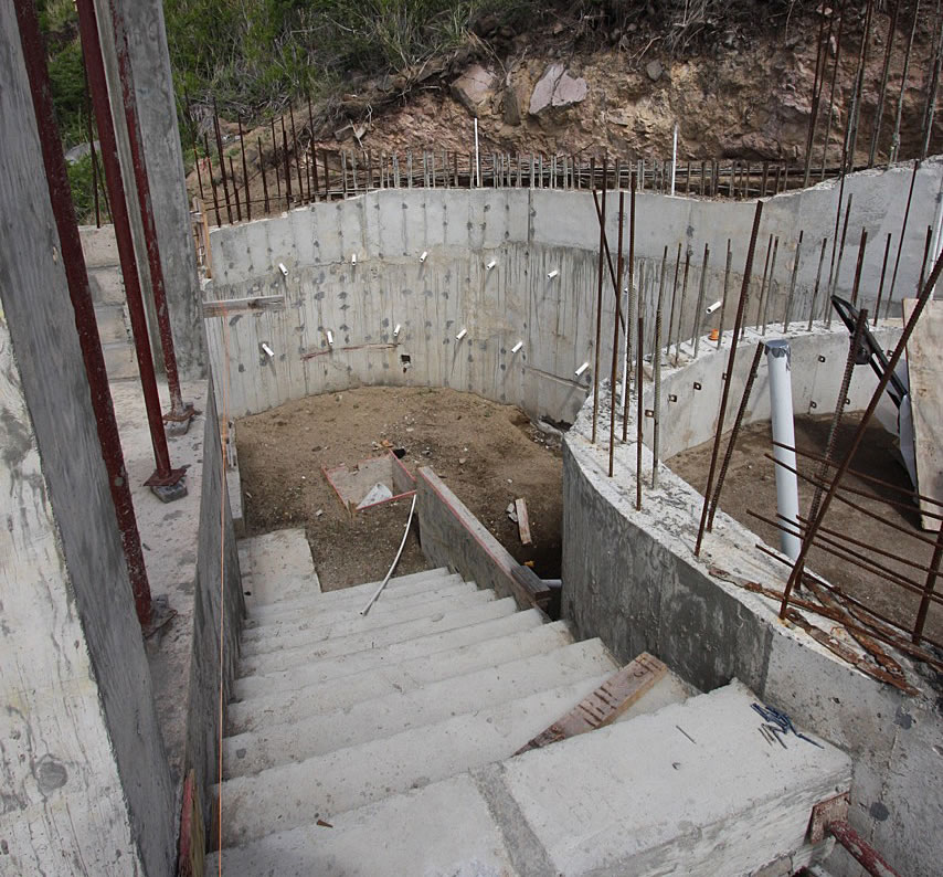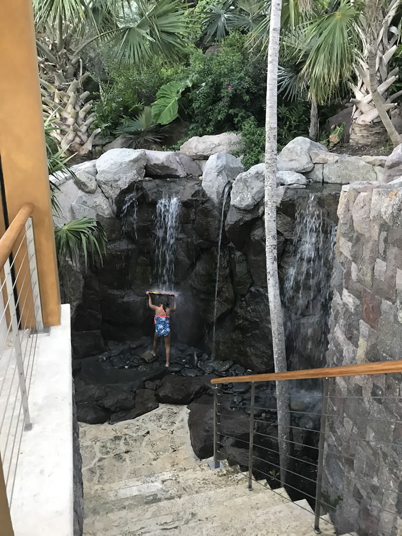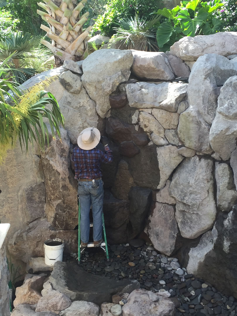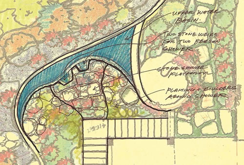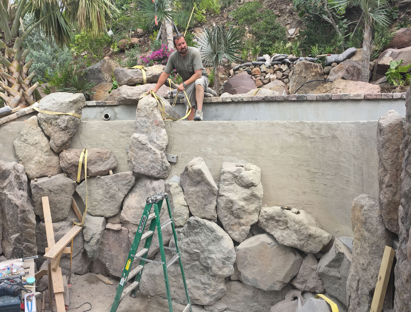 Perched atop a steep hillside, this project showcases a combination waterfall and water wall, where one can rinse off the day’s beach sand and saltwater on the way back from the ocean and before entering the swimming pool. The rock used in this feature was harvested locally, cut into a thick veneer and individually mounted onto the curved concrete wall.